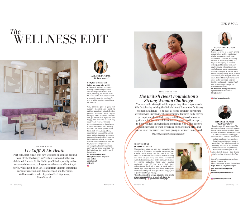 I contribute regularly to Lancashire Life magazine, writing accessible wellness features with a no-nonsense twist. Whether it’s breathwork for energy or staying calm at Christmas, I love sharing tips that help people feel more grounded in everyday life.